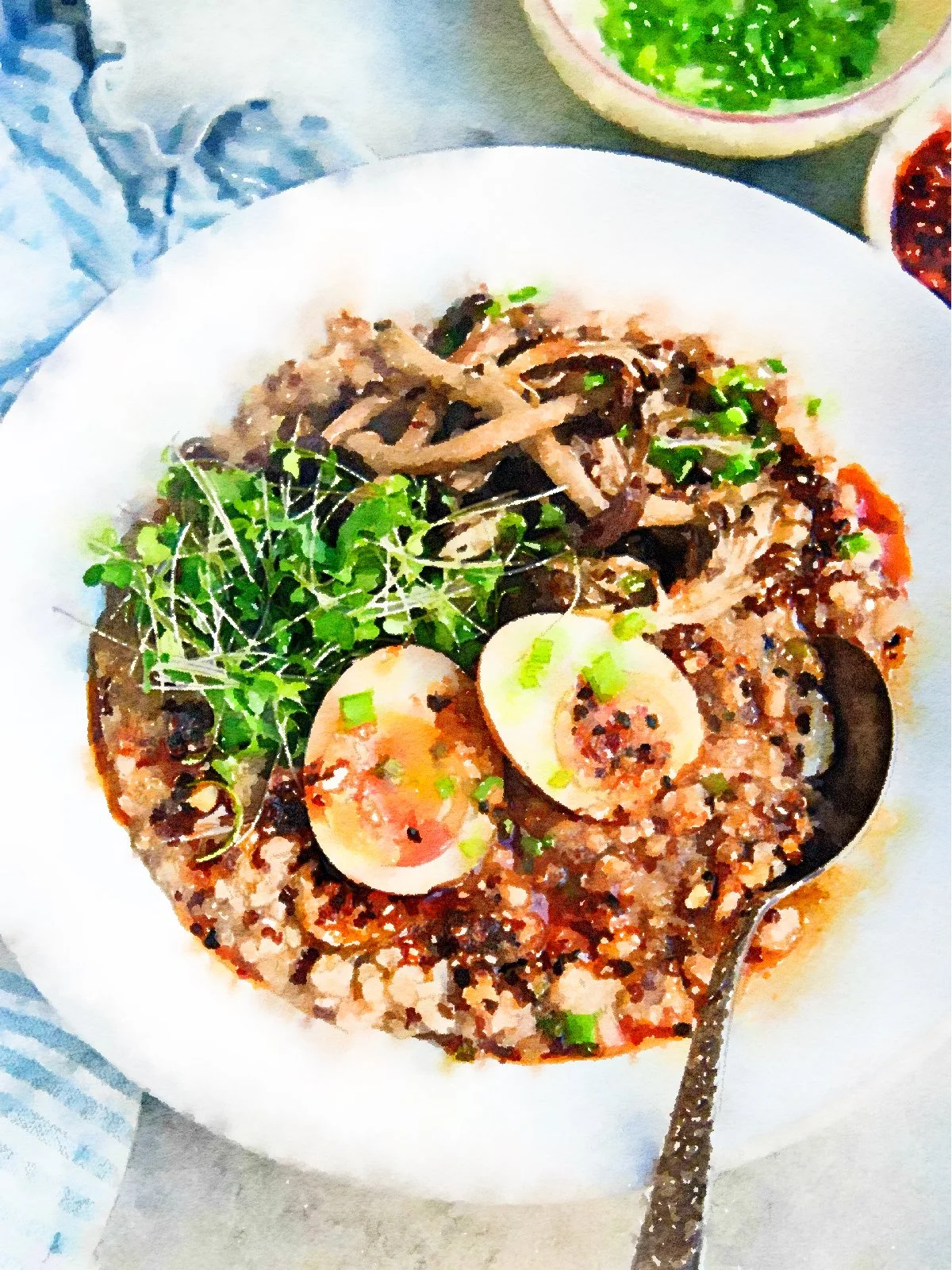 You can add a tablespoon of red miso and butter at the end and swirled into the porridge for an added umami boost…