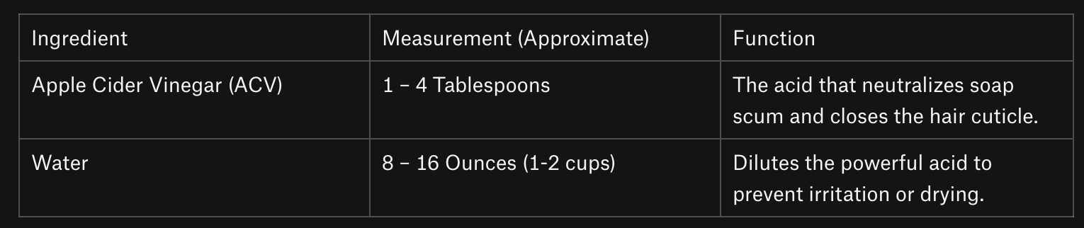 IngredientMeasurement (Approximate)FunctionApple Cider Vinegar (ACV)1 – 4 TablespoonsThe acid that neutralizes soap scum and closes the hair cuticle.Water8 – 16 Ounces (1-2 cups)Dilutes the powerful acid to prevent irritation or drying.