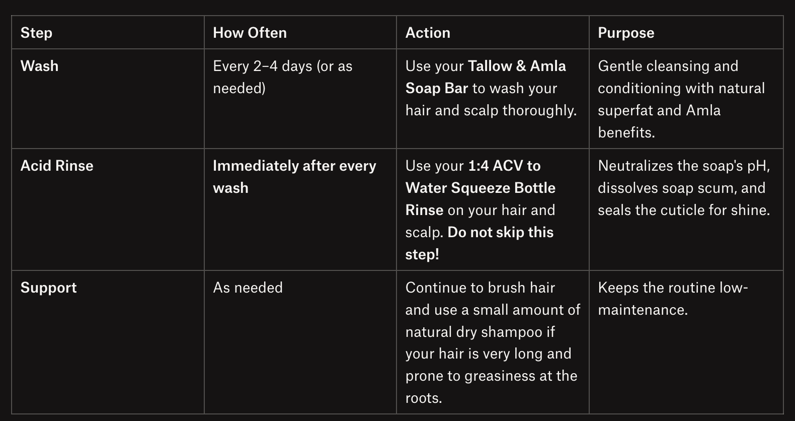 The good news is that for your regular, pure-tallow routine, the rinse is a quick 1-part ACV to 4-8 parts water solution that you just pour over your head!