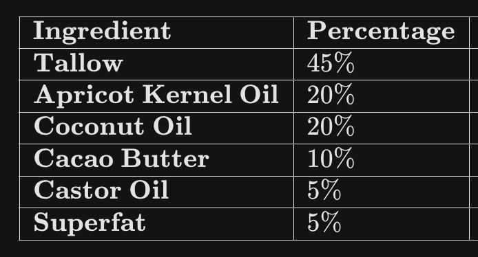 Superfat (The Built-in Conditioner): Your recipe has a $5\%$ superfat. This means $5\%$ of your oils (tallow, apricot kernel, cacao butter, etc.) are left unsaponified (unturned into soap). These are the rich, nourishing oils that deposit onto your hair as you wash, acting as a natural, low-chemical leave-in conditioner.