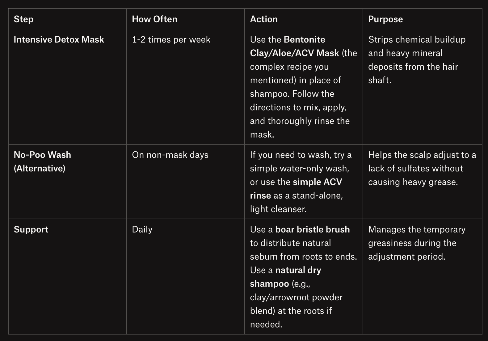 Goal: This is an intensive treatment you would use once a month or during the initial 2-4 week detox transition period to accelerate the removal of old buildup before settling into your routine with the tallow soap and simple ACV rinse.