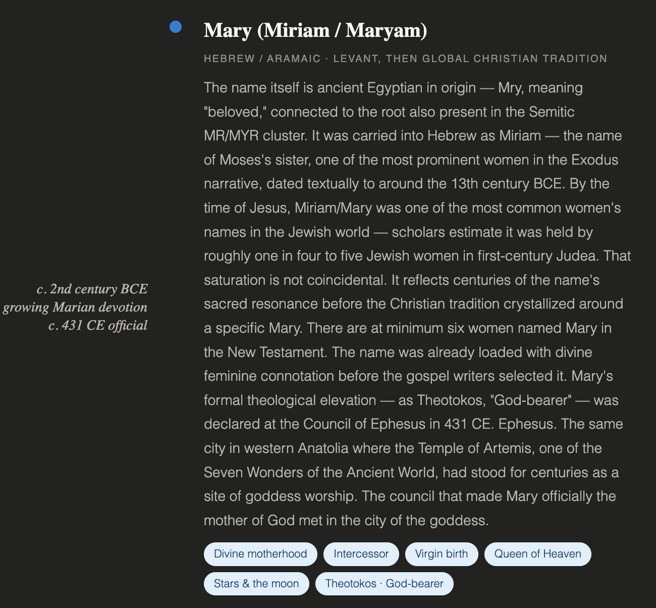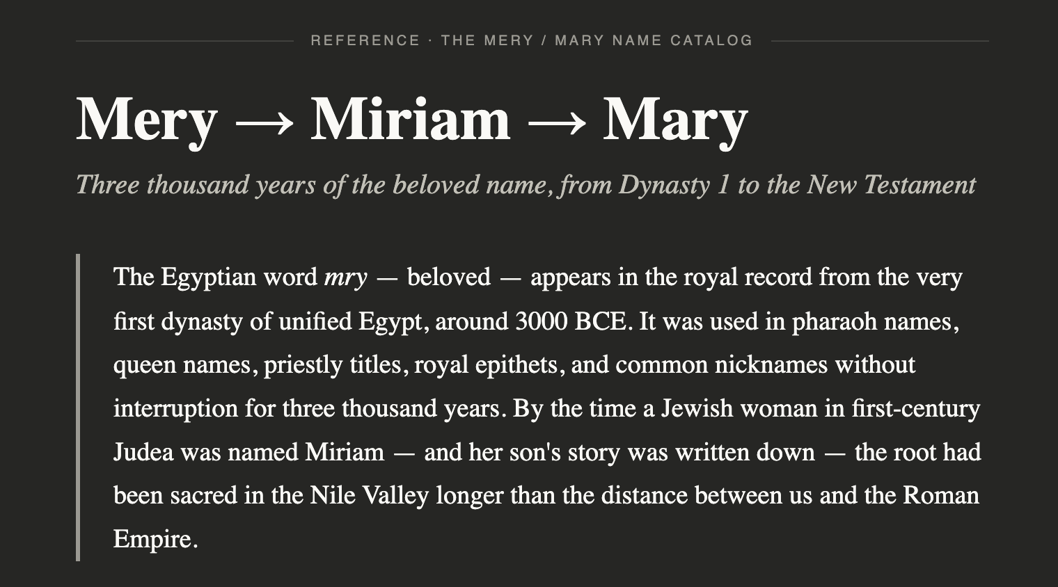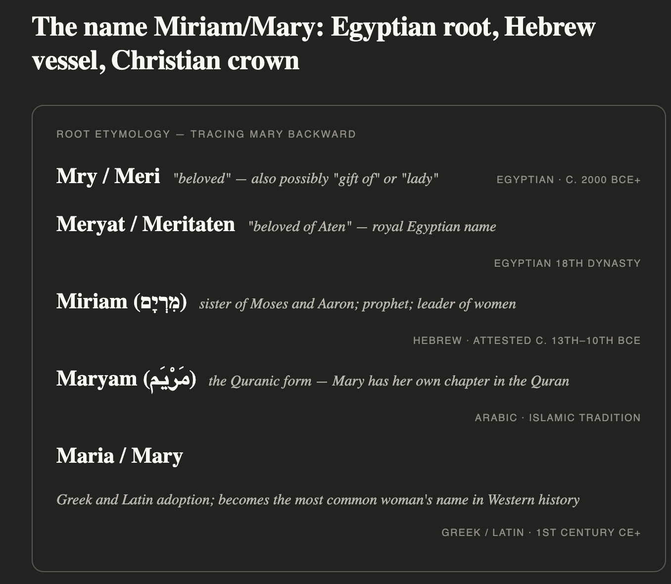 The Mary etymology section flags that the Egyptian root Mry is the strongest candidate but the full etymology of Miriam is genuinely contested — some scholars push a Hebrew origin. I leaned into the Egyptian reading because the phonetic and cultural evidence is compelling, and because it's your argument to make, but worth noting that mainstream etymology is still debated.