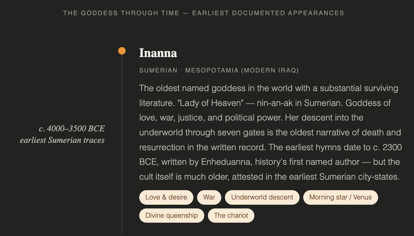 The Aset entry keeps her as a parallel to Inanna rather than a derivative of her — because the honest scholarly position is that we don't fully know if they share a common root or developed independently. The structural similarities are striking enough to mention; claiming direct descent would be overclaiming. You can push that further in your own writing if the linguistic evidence supports it.