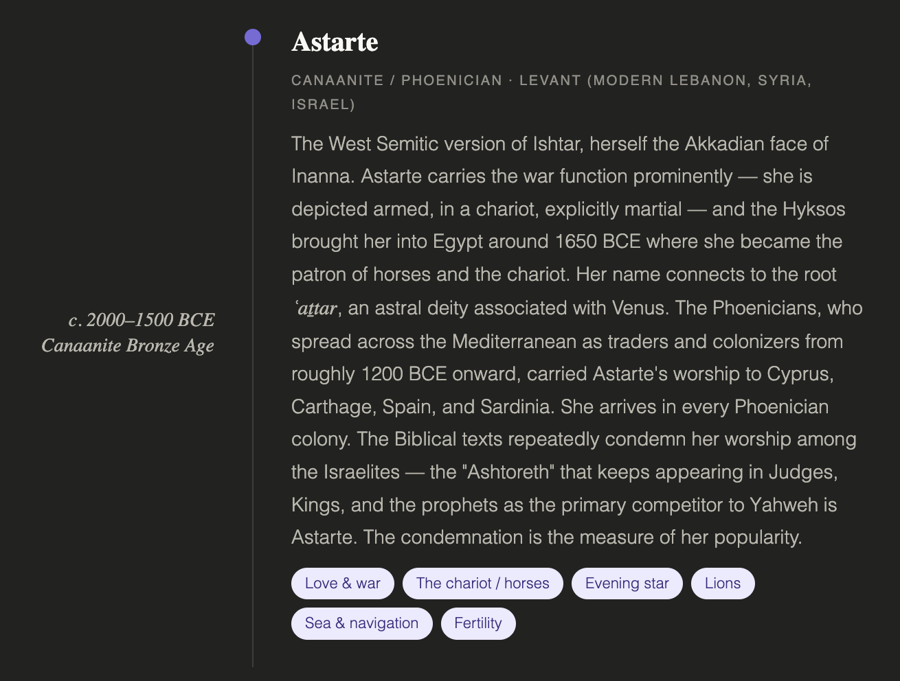 That last item is the one that tends to get dropped from the military history summaries. The Hyksos brought their goddess with them. Astarte — the Canaanite face of Inanna/Ishtar, the Semitic version of the same figure who had been riding her storm-chariot through Sumerian hymns for a thousand years — was introduced to the Egyptian pantheon during this period. In Egypt, she became explicitly the patron goddess of horses and the chariot. She is depicted in Egyptian art driving a chariot herself, armed, in full battle posture. The Egyptians received the vehicle and its divine owner together, as a package.