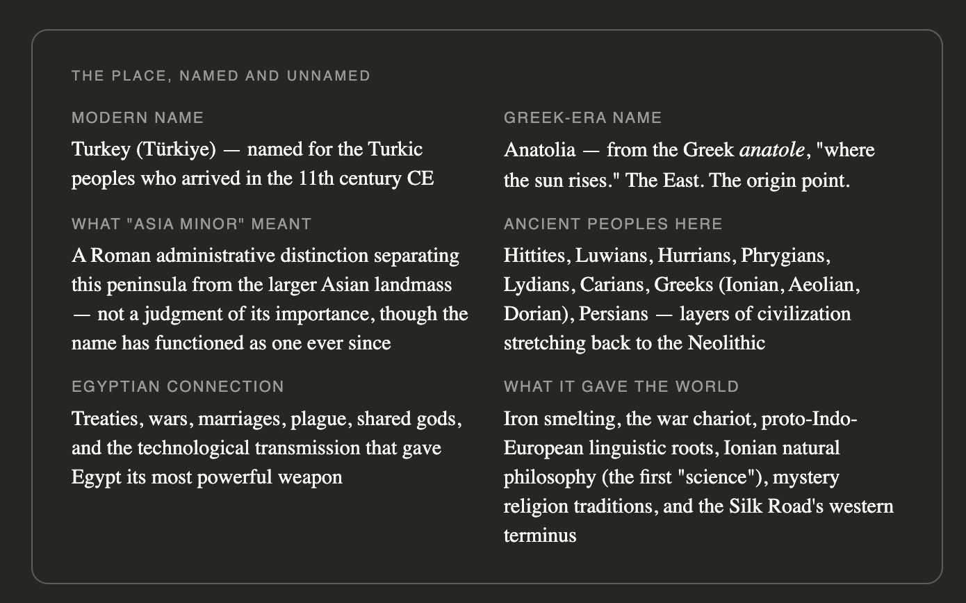 They called it "Minor." As in small. As in less than. Asia Minor — the little Asia, the lesser peninsula. That name tells you everything about who was doing the naming, and nothing at all about the place. What they were calling minor was the origin point of half of what the ancient world ran on: its war technology, its mathematical tradition, its goddess theology, its diplomatic framework, and the vehicle — the chariot — that changed the shape of every empire that ever tried to hold these lands.